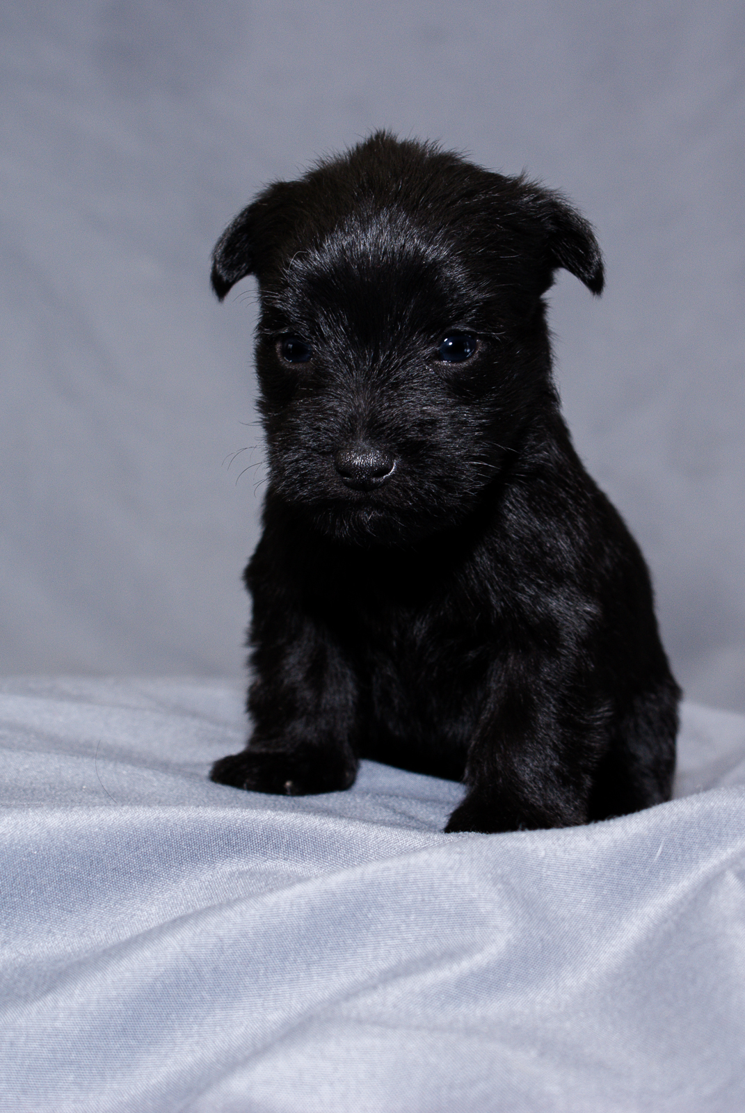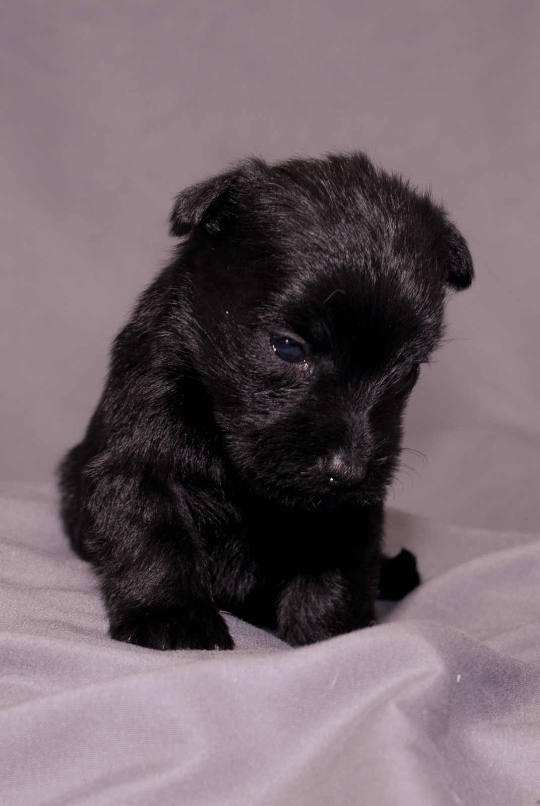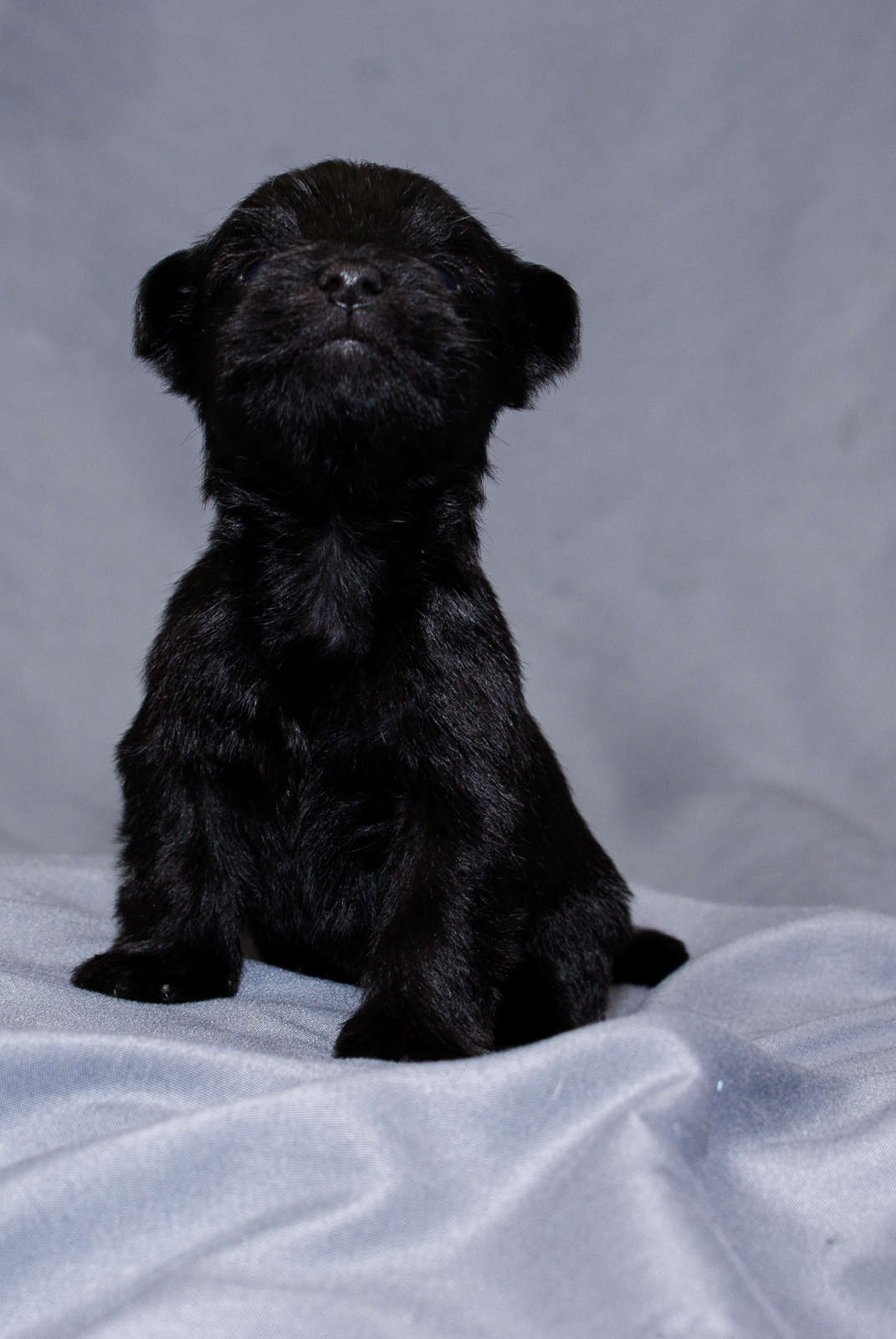 This little black Schnauzer Yorkie mix is the smallest of the litter, but sure can hold her own with her litter mates. When we were photographing the pups, she emerged as a true natural in front of the camera. Her eyes are fully open and becoming more stable while walking. Beginning to bark, growl and play with litter mates.