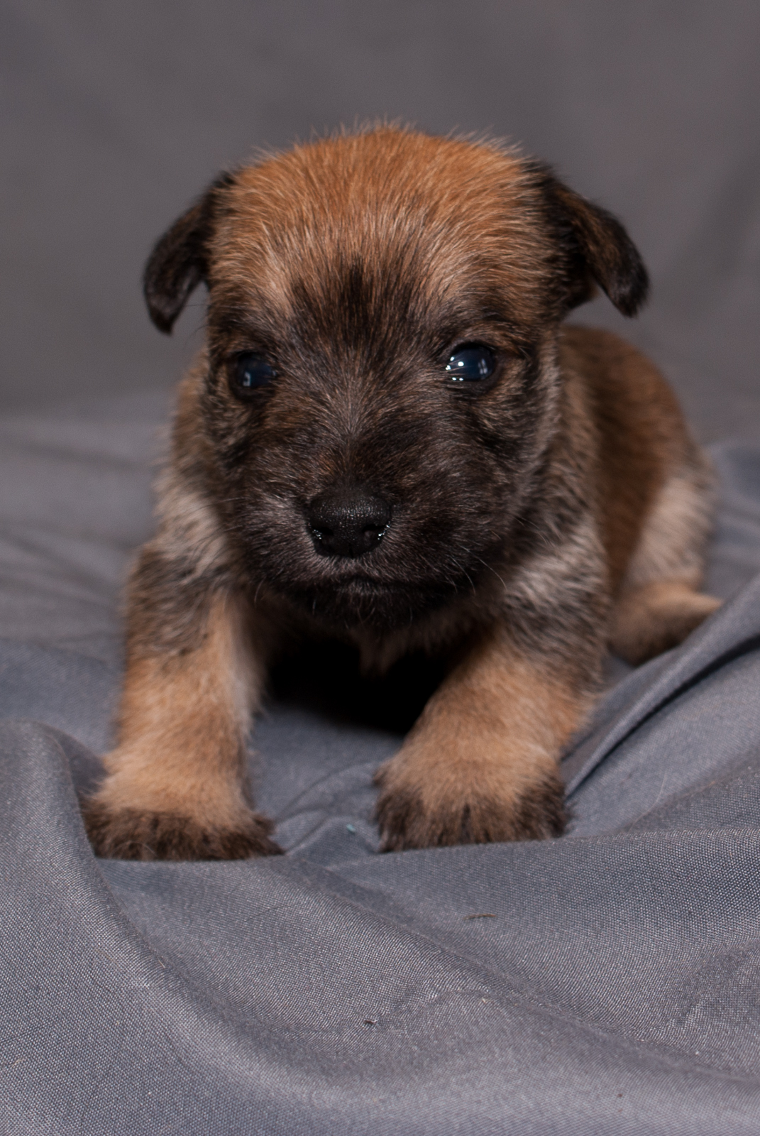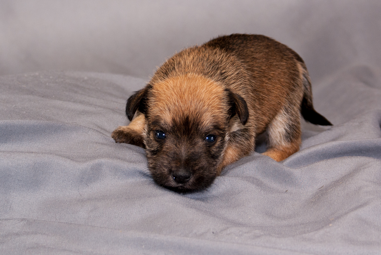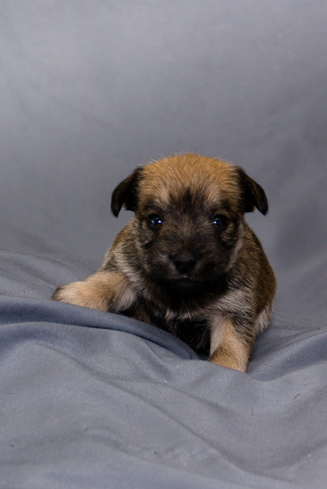 This Schnauzer Yorkie pup is average size. Her coat is a mostly brown with a mix of black. Her eyes are fully open and becoming more stable while walking. Beginning to bark, growl and play with litter mates.